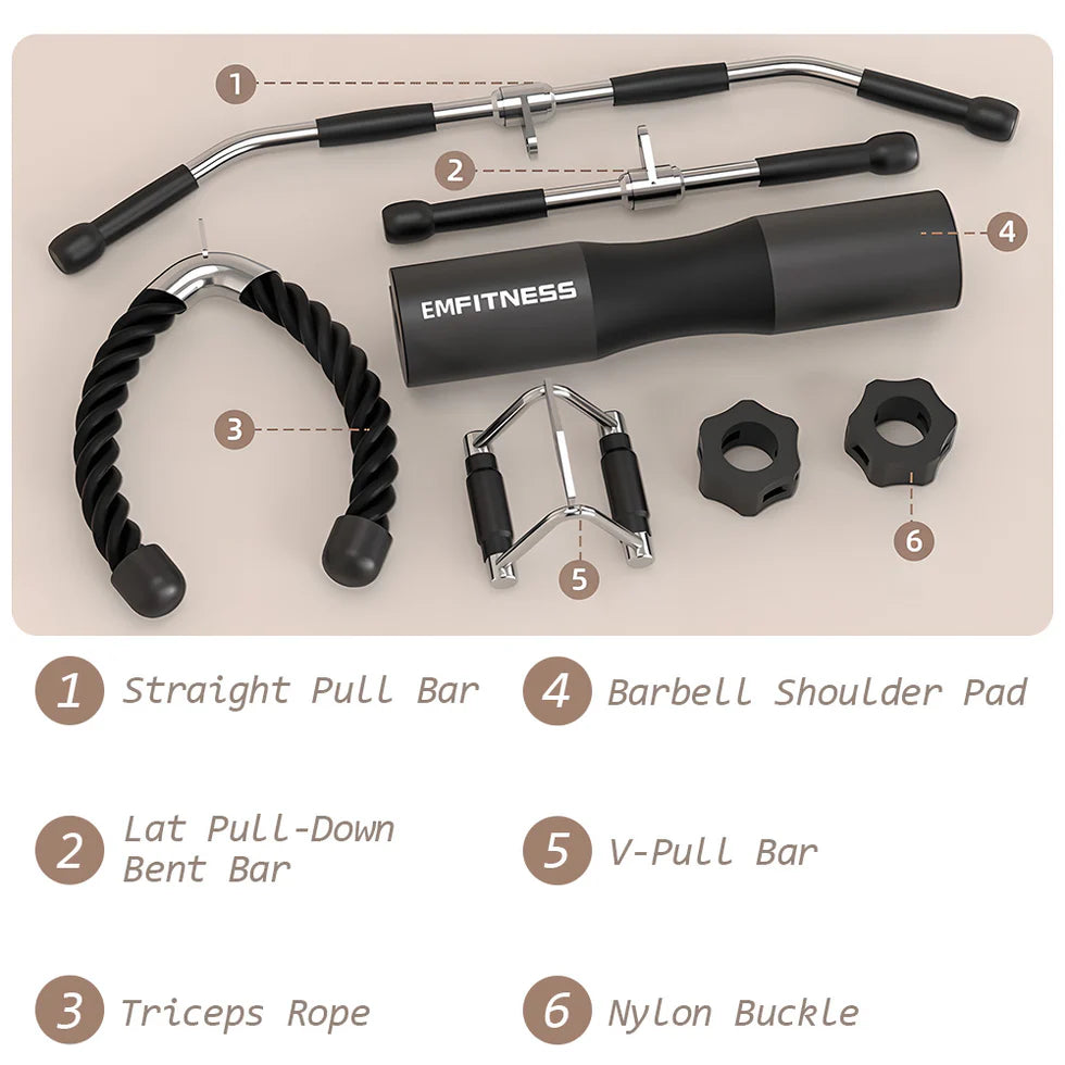 A: Comprehensive 6-piece package includes straight bar, lat pulldown bar, triceps rope, V-handle, shoulder pad, and nylon ankle straps.