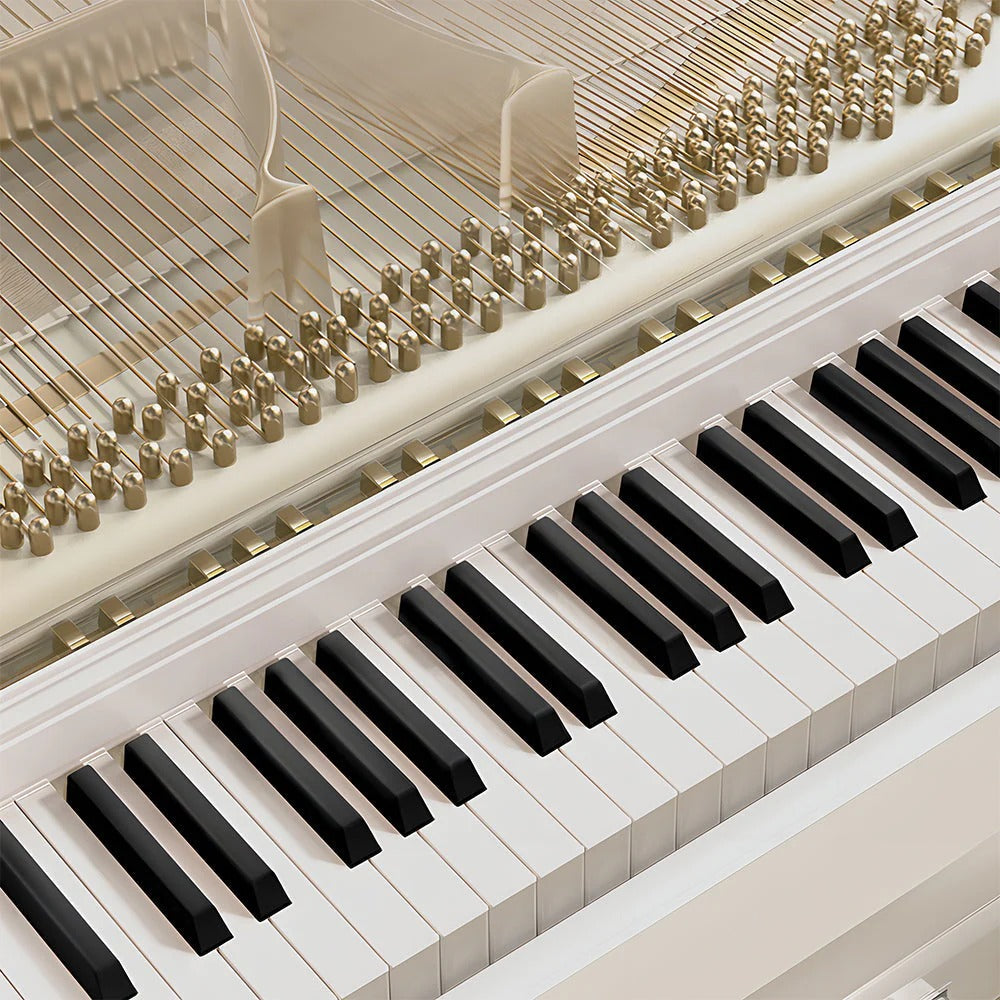 When not in use, the hidden sliding keyboard tray conceals the piano keys, presenting a clean, refined appearance that complements any room décor. With a simple slide-out motion, you unlock a complete weighted piano experience with dynamic touch response, Bluetooth connectivity, and professional-grade features—all while maintaining the aesthetic elegance of a designer furniture piece.