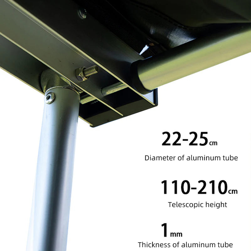 The Car Side Tent delivers premium dual-function sunshade and rainproof protection, combining advanced 420D Oxford fabric with black rubber coating engineering for exceptional UV blocking, weather resistance, and outdoor durability. This innovative side tent features parallel expansion design enabling rapid deployment covering 2.5-4 square meters accommodating 3-5 people simultaneously, transforming vehicle sides into multifunctional outdoor entertainment spaces ideal for self-driving camping, recreational picnics, fishing expeditions, and family travel adventures. Engineered with sophisticated double-layer protective structure combining 420D densely woven Oxford fabric base material with thickened black rubber coating inner layer, this tent provides ultimate protection against outdoor elements including branches, sand, gravel impact, and environmental wear. The premium black rubber coating contains nano-zinc oxide particles actively absorbing and converting ultraviolet rays, delivering UPF≥50+ rating blocking 99%-99.8% of harmful UV rays while maintaining interior temperatures 6-10°C cooler than exterior conditions—essential thermal efficiency for desert environments, coastal areas, and extreme sun-exposure scenarios. Advanced PU3000mm waterproof outer coating paired with pressure-bonded seam treatment enables confident handling of sustained rainfall, withstanding 1-hour rainstorm testing without water infiltration while water droplets quickly slide off preventing accumulation. The sophisticated support structure combines aviation-grade aluminum alloy brackets (21-22mm diameter, 1.0-1.2mm wall thickness) with anodic oxidation surface treatment and ABS engineering plastic connectors ensuring lightweight corrosion-resistant construction with firm connections and deformation-resistance. The intelligent cloth-rolling folding design enables single-person deployment and storage within 1-5 minutes without requiring complex tools or professional installation skills. The reliable fixing system includes vehicle edge clamps compatible with 98% of mainstream vehicle models, paired with high-strength windproof ropes and carbon steel ground nails enabling level 7 wind resistance—maintaining structural stability even during rainstorm conditions with zero tent sway and water accumulation risk. The parallel expansion design accommodates flexible coverage ranging from 160×250cm to 250×300cm providing versatile space configurations for diverse recreational scenarios. Premium additional features include optional built-in LED light strips with adjustable brightness for nighttime illumination, hanging rings enabling attachment of atmosphere lighting and storage baskets, and compatible detachable curtain options providing simultaneous ventilation and privacy protection. The remarkably lightweight 9.25-13.2kg total weight with convenient oxford cloth storage bag enables effortless transport and vehicle trunk storage without space constraints. Perfect for self-driving camping enthusiasts, outdoor picnic lovers, fishing adventurers, family travel groups, UV-conscious travelers, coastal and desert explorers, and anyone deserving premium dual-function outdoor shade combining exceptional sun and rain protection with convenient portability and rapid deployment.