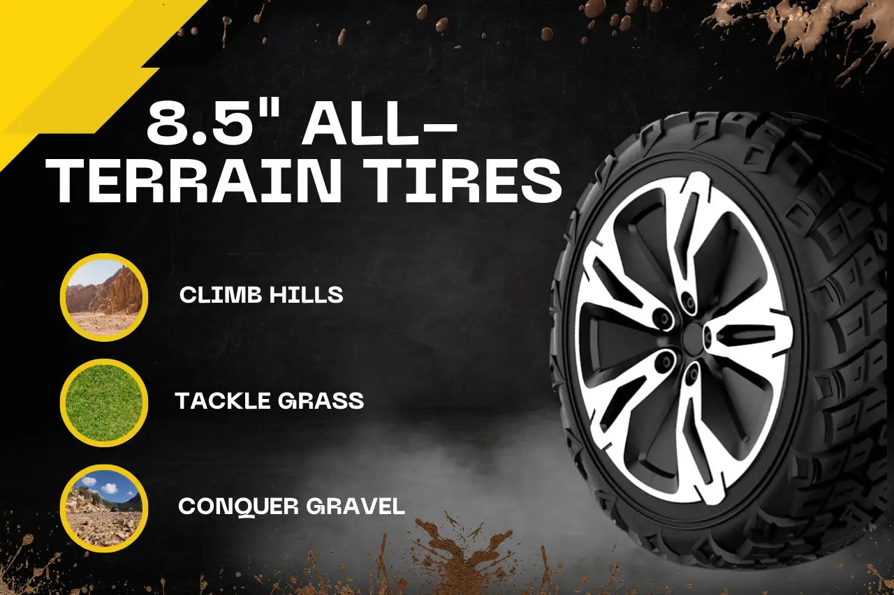 - Tire Size: 8.5" All-Terrain Off-Road Tires