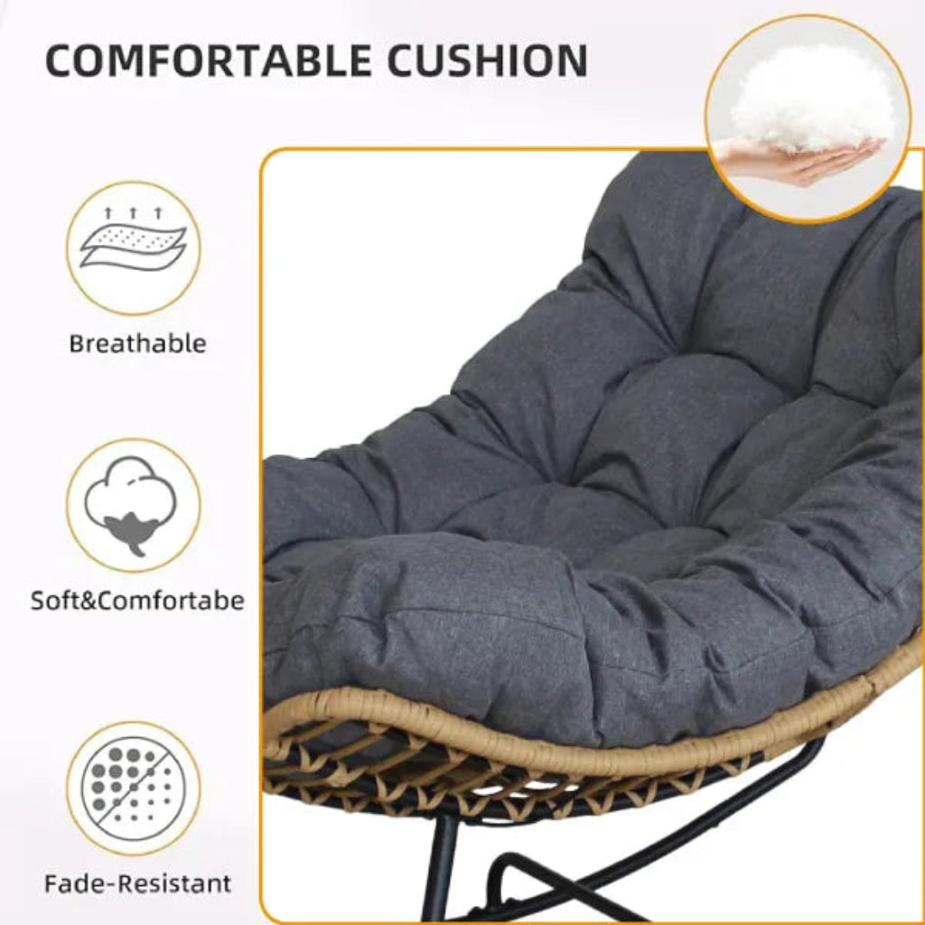 Q: How do I maintain this rocking chair? A: Maintenance is easy—wipe the PE rattan with a damp cloth regularly to remove dust and debris. Clean the steel frame with a soft cloth as needed. Remove and spot clean the cushion periodically. If used outdoors, bring indoors or cover during harsh weather. Check and tighten hardware occasionally to ensure stability and smooth rocking motion.