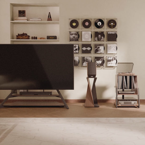 Elevate your media setup with this elegant record storage and audio rack. Blending clean lines and compact form, it offers dedicated vinyl organization, accessory storage, and device support—ideal for vinyl lovers seeking style and utility in one piece.